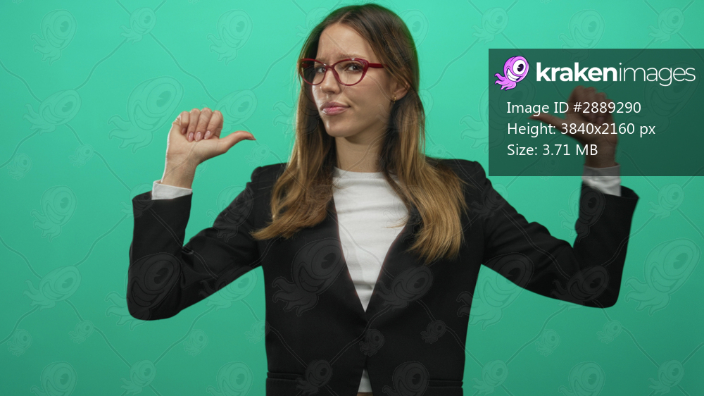 Young hispanic woman pointing thumbs at herself in a green studio set; bold confidence and self assertion.