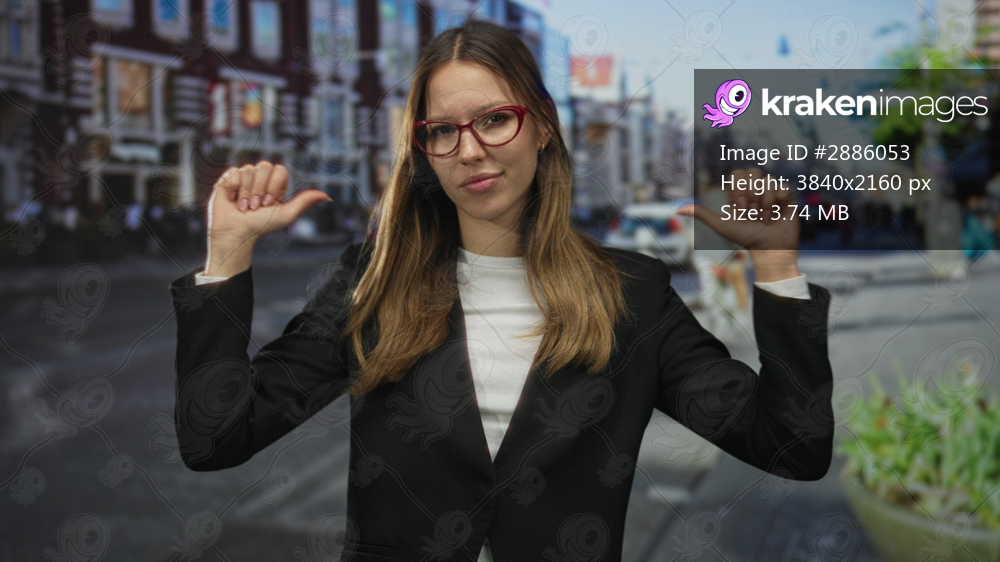 Young hispanic woman pointing thumbs to herself on a busy city street wearing red glasses and black blazer and white shirt; confidence.