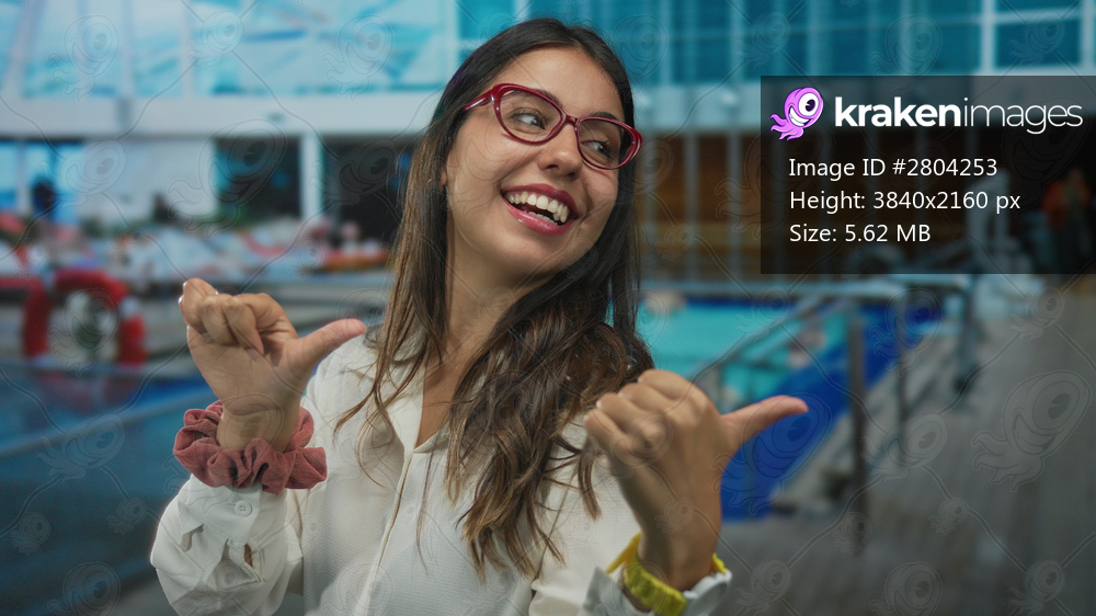 Young hispanic woman pointing thumbs to side inside a modern building interior with glass panels and railings; playful confidence.