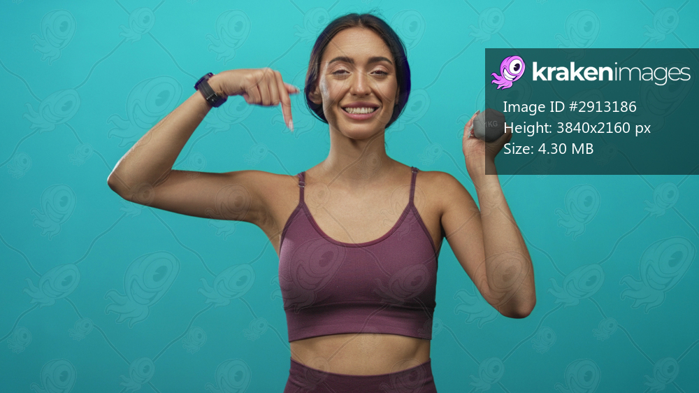 Young hispanic woman pointing to toned arm while holding a 1kg dumbbell in a teal studio; confidence wellness health.