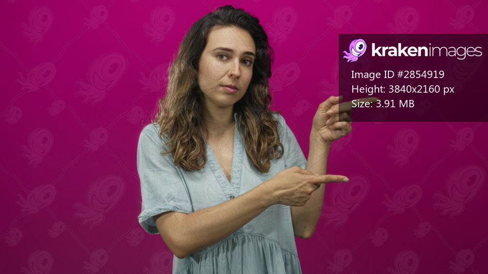 Young hispanic woman points both fingers to the right toward empty space in pink studio; skepticism.