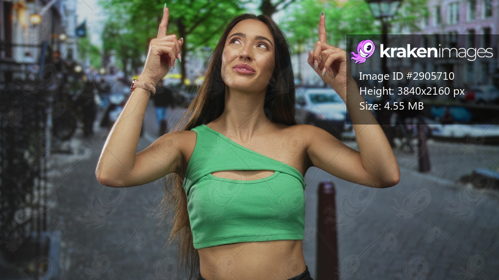 Young hispanic woman points both index fingers upward on street, showing bare midriff and bare shoulders in a green one shoulder top; playful joy.