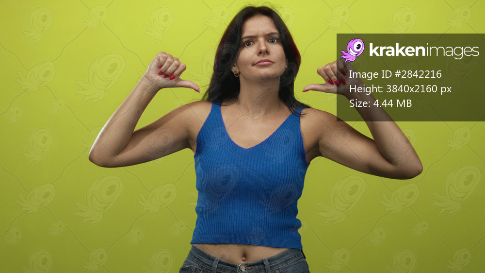 Young hispanic woman points both thumbs to chest in green studio; confidence empowerment identity pride.