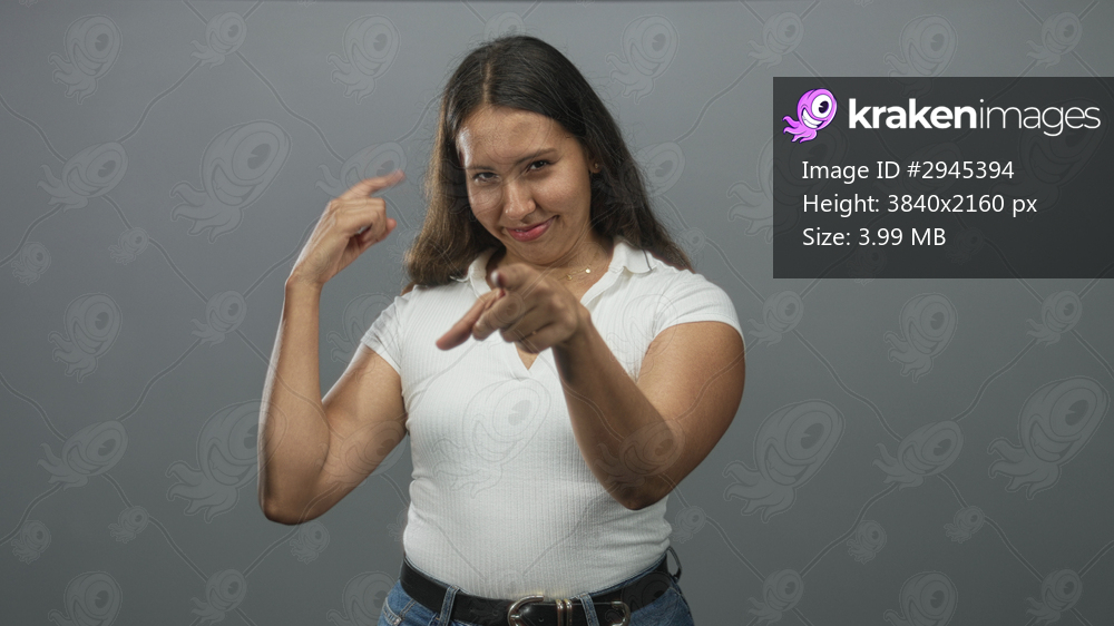 Young hispanic woman points finger at camera in gray studio wearing white polo and jeans, smiling with direct gaze; playful invitation.