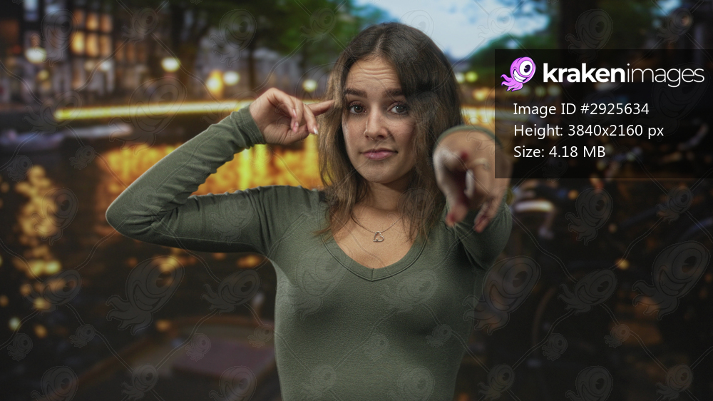 Young hispanic woman points finger at camera and taps temple on a canal street in amsterdam at dusk; skeptical defiance.