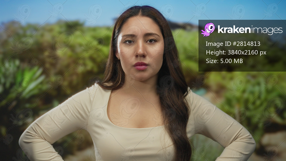 Young hispanic woman points finger directly at camera while standing before lush green foliage in forest; anger.