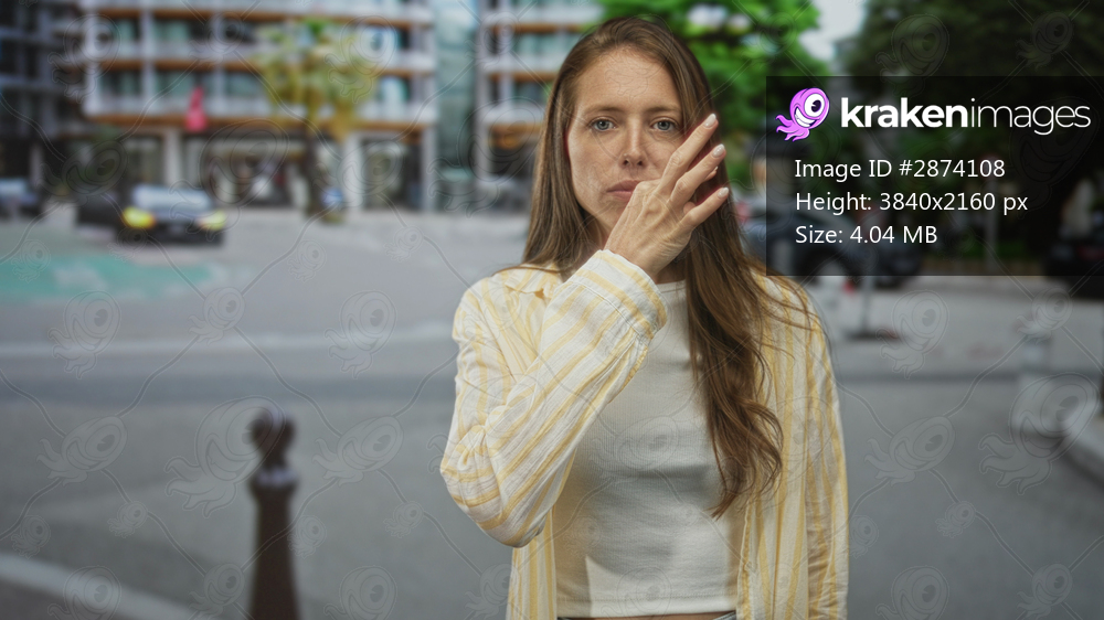 Young hispanic woman points finger forward near her face on a busy city street wearing a yellow striped shirt and white crop top; confidence decision intent. - Kraken Images