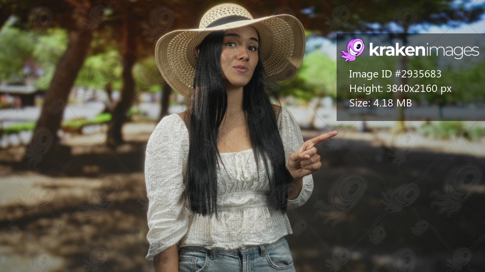 Young hispanic woman points finger in forest wearing straw sunhat, white peasant blouse and denim jeans, long black hair visible; playful confidence.