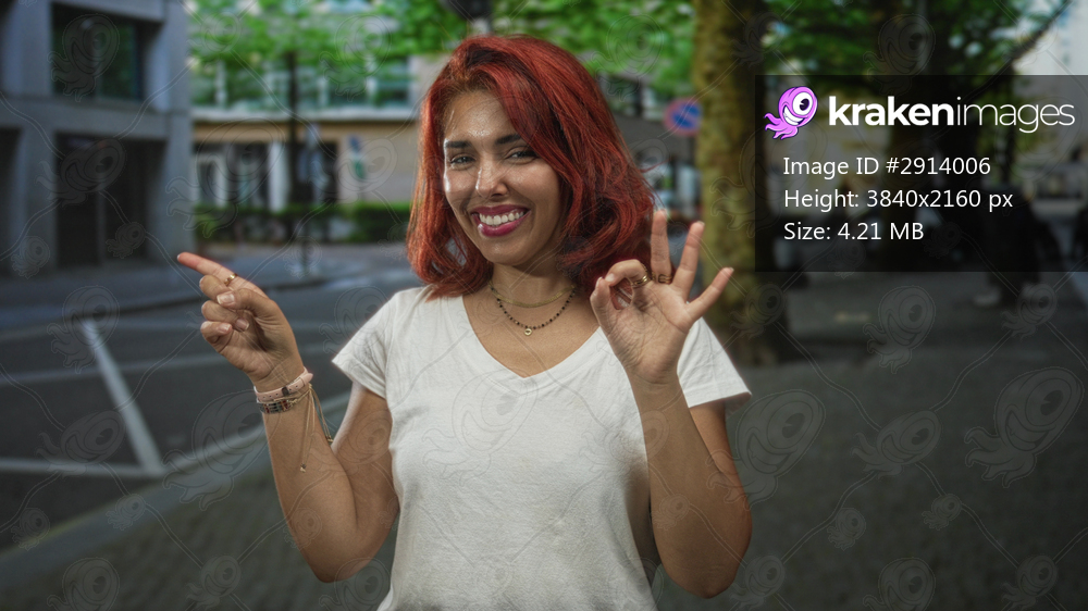 Young hispanic woman points finger and makes ok sign on city street while smiling with closed eyes; joy confidence.