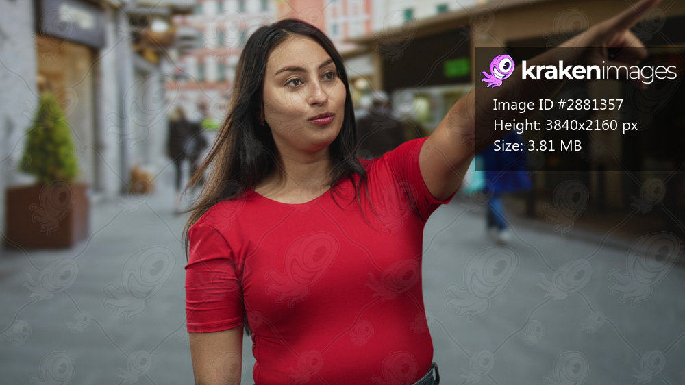 Young hispanic woman points finger on city street in red shirt smiling and reaching out; joy friendly greeting.