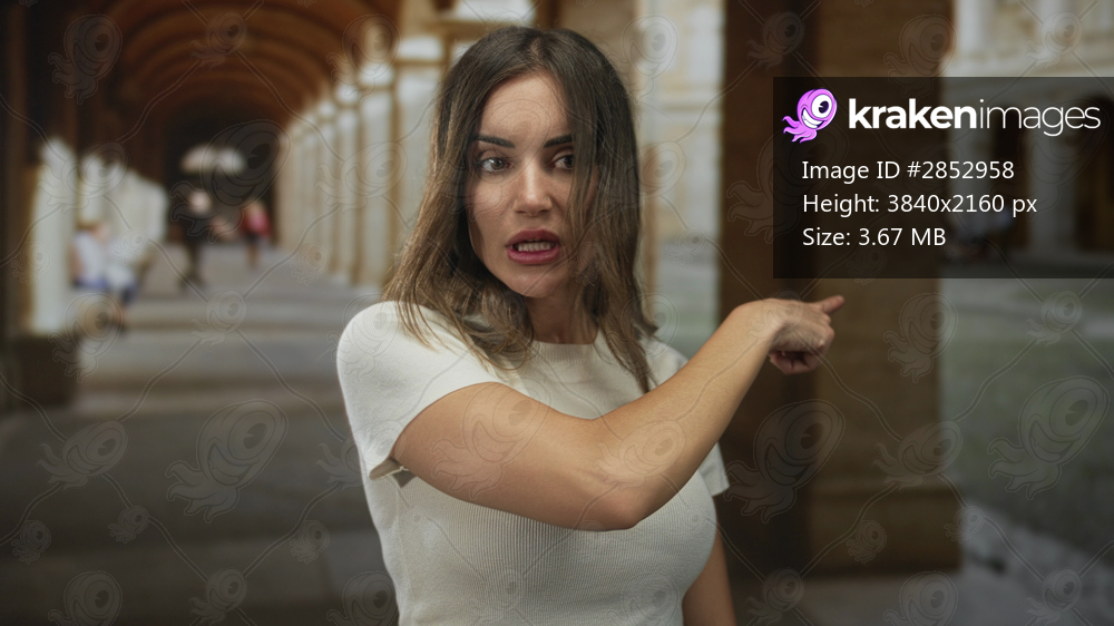 Young hispanic woman points finger to arched corridor building on cobblestone street in old town; curiosity.