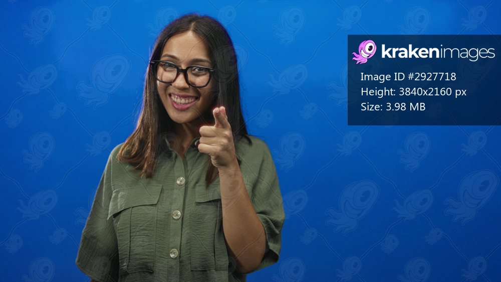 Young hispanic woman points finger to camera in studio with blue backdrop, wearing glasses and olive shirt; playful confidence.