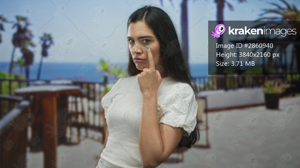 Young hispanic woman points finger to eye on outdoor building terrace by the ocean, direct stare and upright index finger; vigilance security.