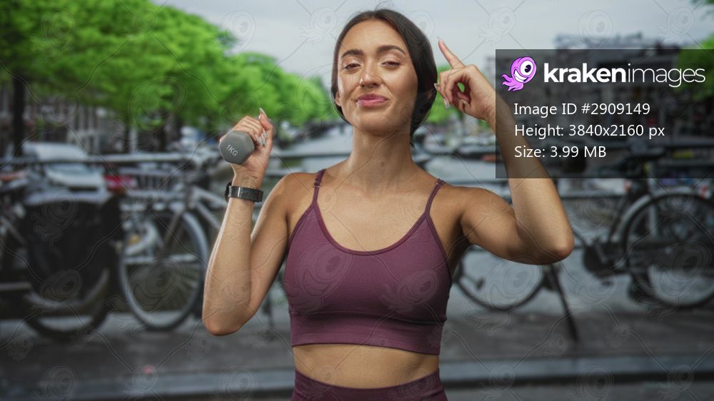 Young hispanic woman points finger to head while holding a 1kg dumbbell on amsterdam street; confidence fitness wellness.