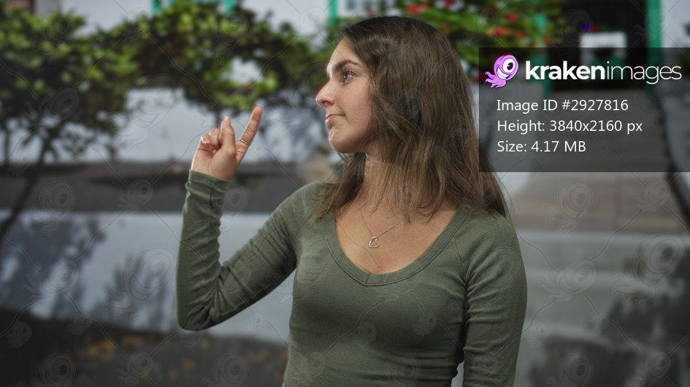 Young hispanic woman points finger to left on street by building steps with heart pendant visible; confidence.