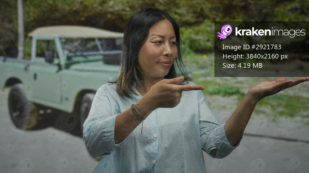 Young hispanic woman points finger to open palm on street beside offroad vehicle and leafy roadside; playful curiosity.