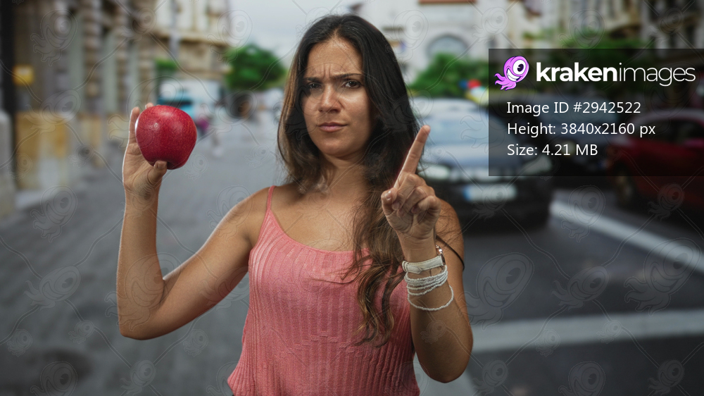 Young hispanic woman points finger to red apple while holding it near chest on a busy city street with cars behind; assertive caution.