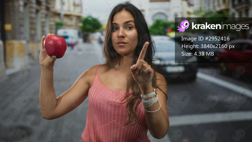Young hispanic woman points finger to red apple while holding it near chest on a busy city street with cars behind; assertive caution.