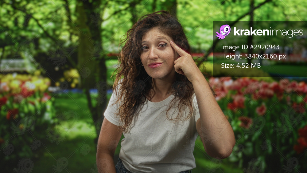 Young hispanic woman points finger to temple in green park among tulips and trees near wooden bench and lawn; thoughtful idea pondering.