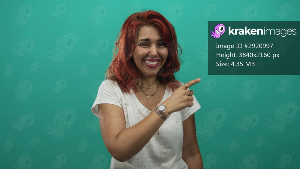 Young hispanic woman points finger to the right in a bright teal studio, smiling and winking; playful confidence.
