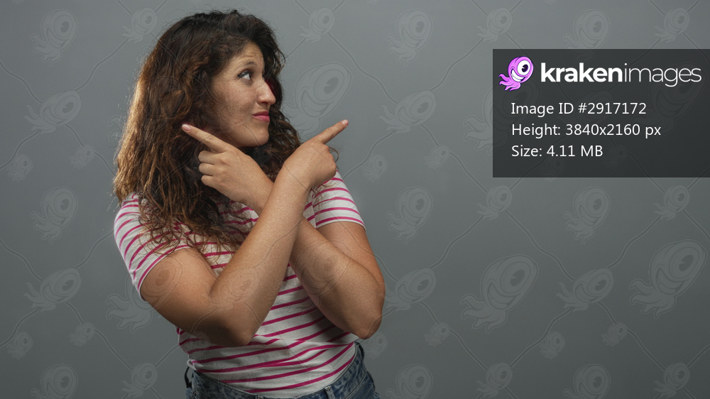 Young hispanic woman points finger to the right in gray studio wearing striped shirt and denim jeans; curiosity interest.
