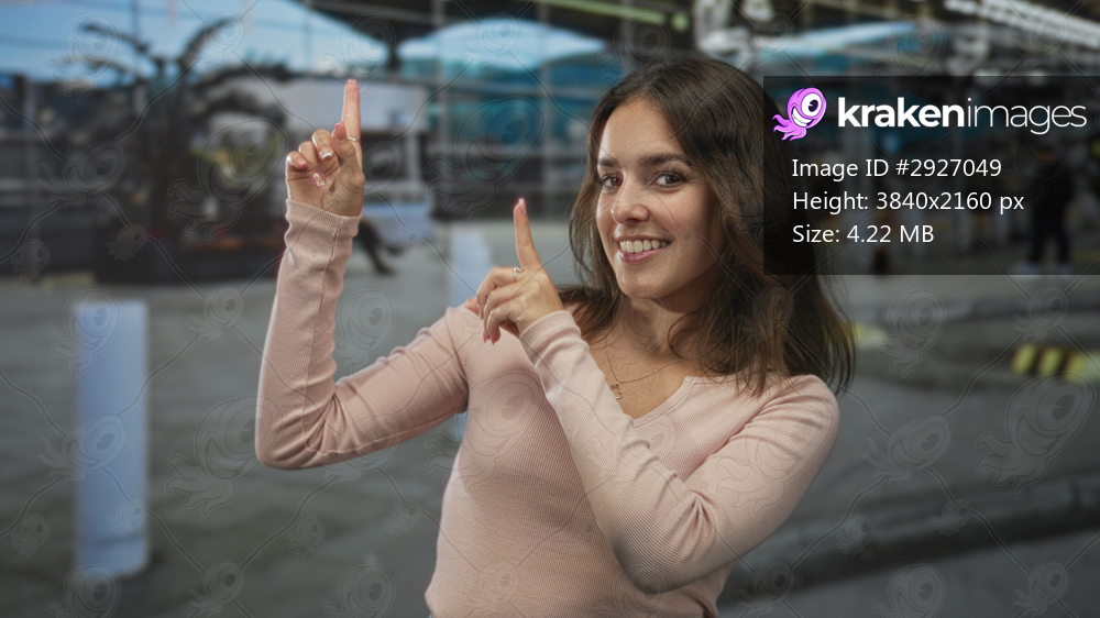 Young hispanic woman points finger upward in an airport terminal outdoors, smiling and looking up at departure signs while awaiting a flight; travel joy. - Kraken Images