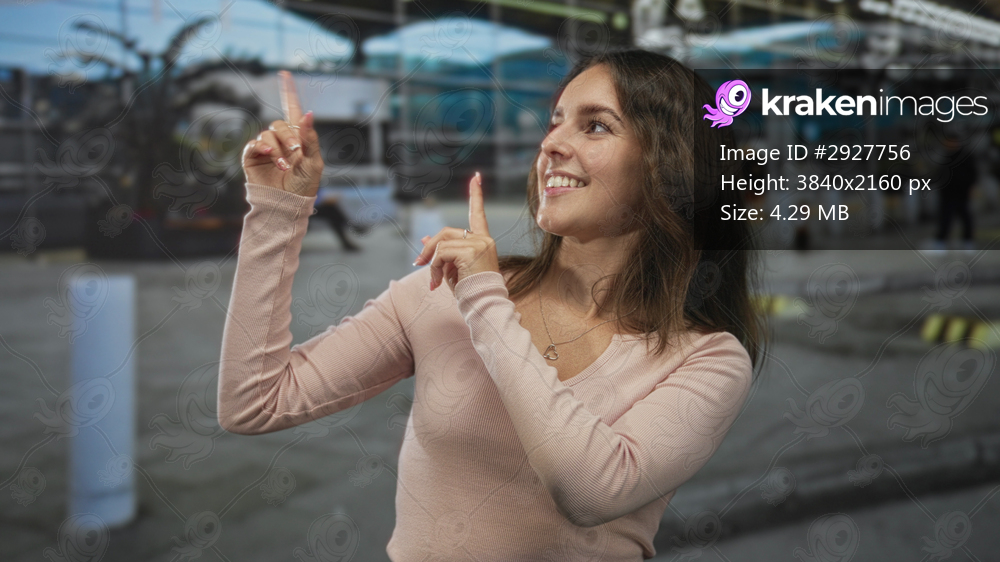 Young hispanic woman points finger upward in an airport terminal outdoors, smiling and looking up at departure signs while awaiting a flight; travel joy. - Kraken Images