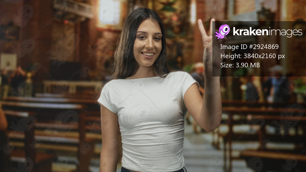 Young hispanic woman points finger upward while smiling in a catholic church among wooden pews and ornate altar; serenity faith reflection.