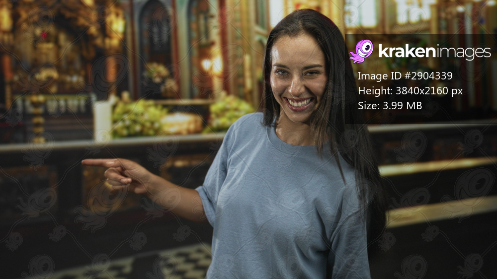 Young hispanic woman points finger while smiling and laughing during a service near the altar in a catholic church interior; joy faith.