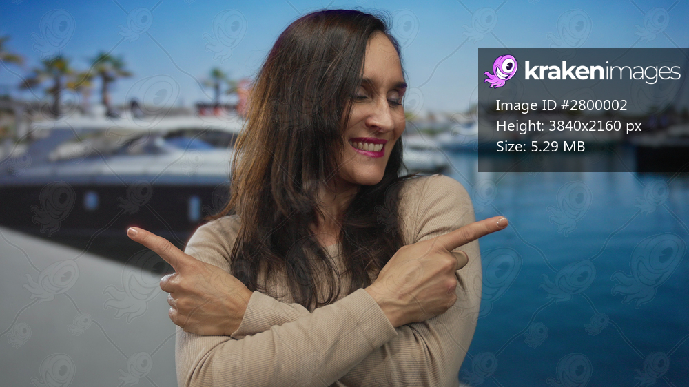 Young hispanic woman points fingers in opposite directions at sunny port; indecision choice options.