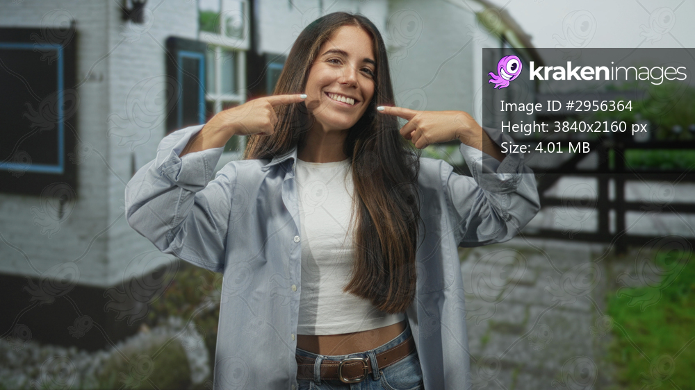 Young hispanic woman points fingers to cheeks and smiles in front of building by a wooden gate and stone path; joy confidence.