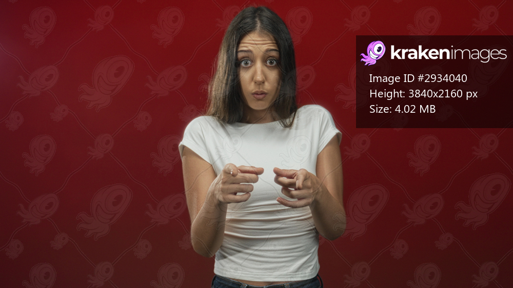 Young hispanic woman points fingers toward camera showing visible hands and puckered mouth in red studio; surprise.