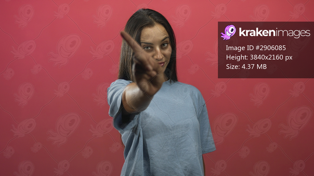 Young hispanic woman points hand forward toward camera in pink studio wearing light blue t shirt with direct gaze; confidence.