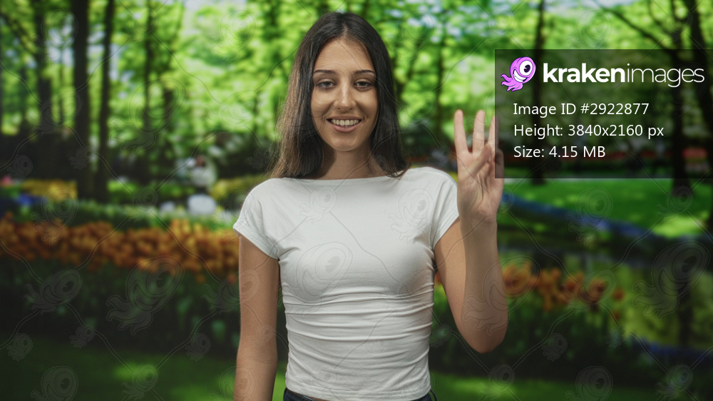 Young hispanic woman points index finger upward in a forest park with green trees and tulip beds and relaxed smile; confidence.