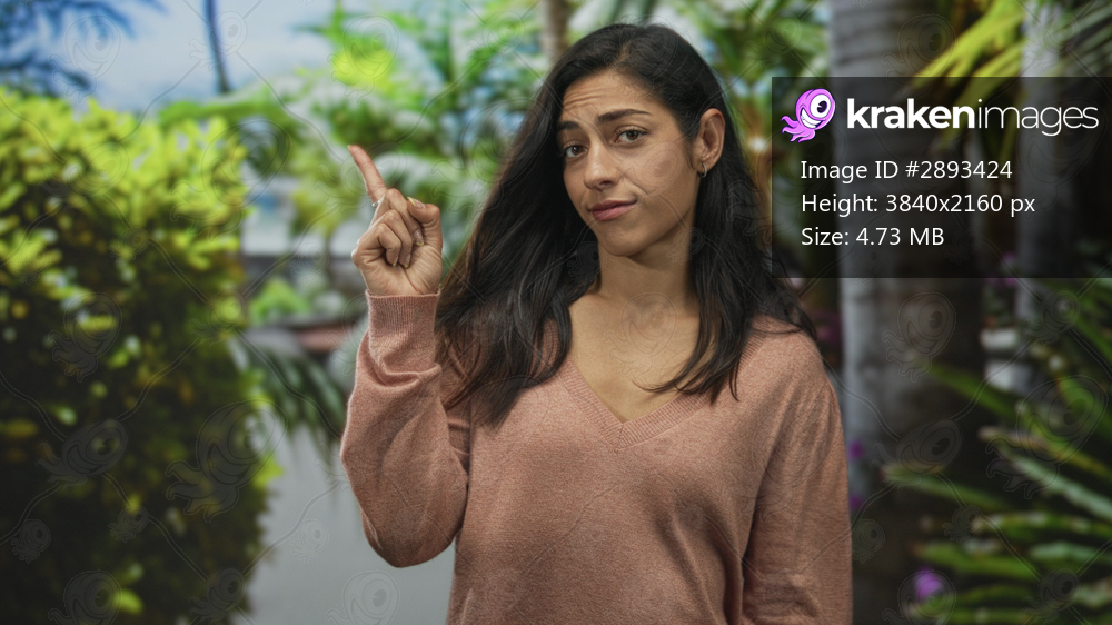 Young hispanic woman points index finger upward in a green park with palm trees and dense foliage while wearing a v neck sweater; confidence persuasion. - Kraken Images