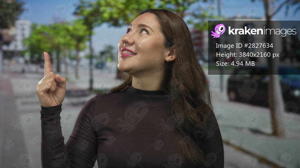 Young hispanic woman points index finger upward on city street near parked cars and trees; confidence.
