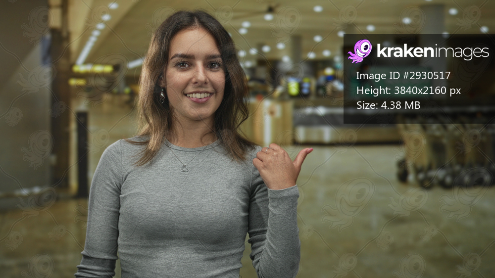 Young hispanic woman points thumb at baggage carousel in airport terminal, visible hand and heart necklace; anticipation travel ease.