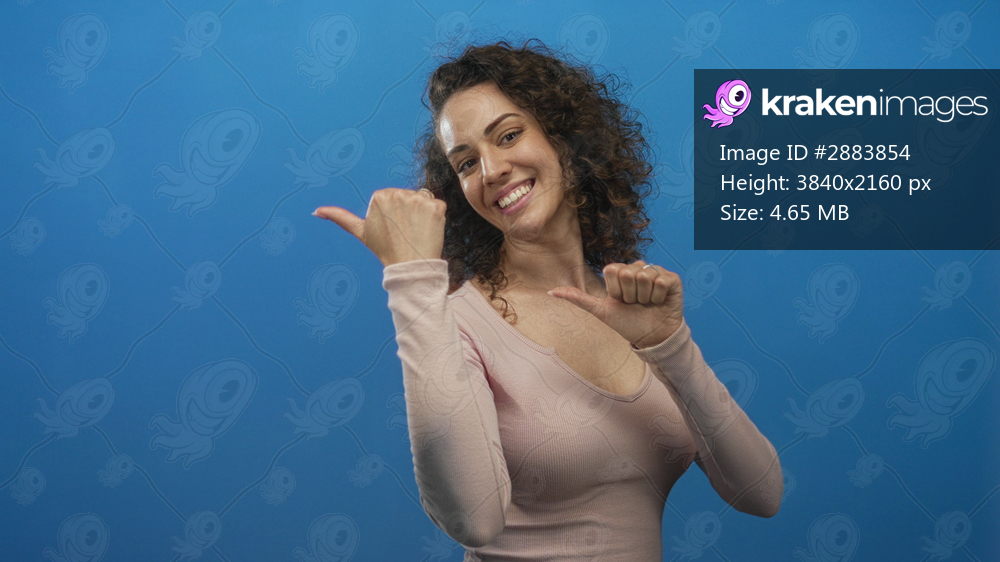 Young hispanic woman points thumb to self and smiles with visible hands in blue studio; confidence playful pride.
