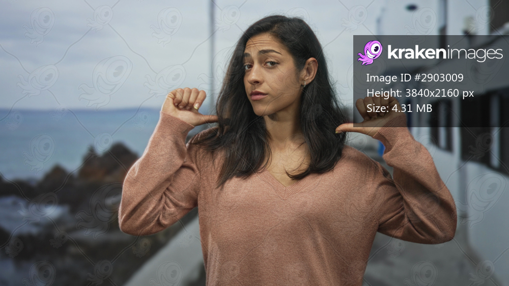 Young hispanic woman points thumbs to chest on a seaside street promenade near white building, hands and face visible; quiet confidence.