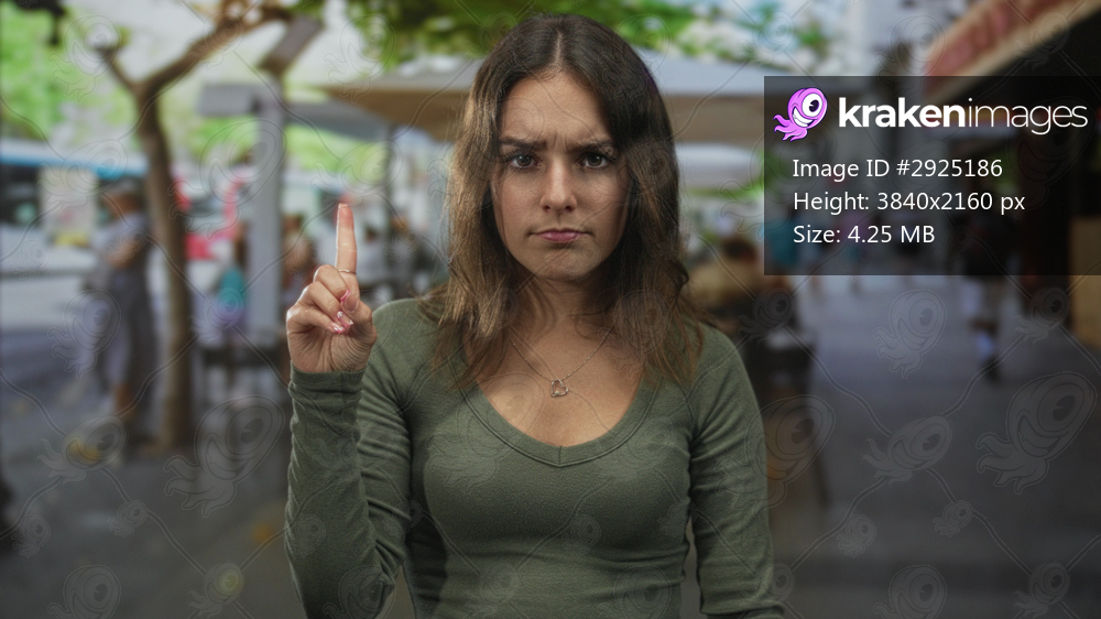 Young hispanic woman points two fingers to nose at street cafe terrace outdoors while seated at a table, wearing a heart pendant; annoyance impatience. - Kraken Images