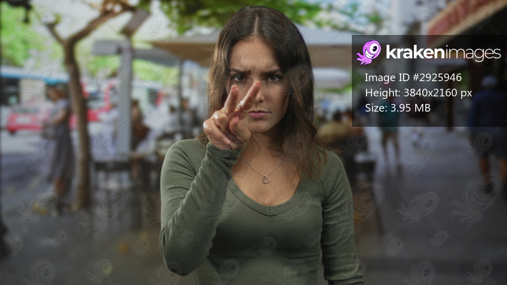 Young hispanic woman points two fingers to nose at street cafe terrace outdoors while seated at a table, wearing a heart pendant; annoyance impatience. - Kraken Images