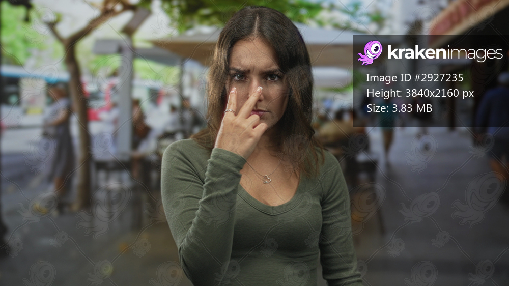Young hispanic woman points two fingers to nose at street cafe terrace outdoors while seated at a table, wearing a heart pendant; annoyance impatience. - Kraken Images