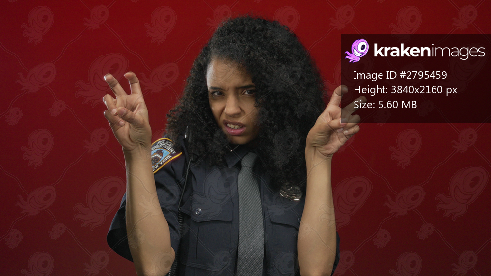 Young hispanic woman police officer with badge makes air quotes in studio; sarcasm doubt irony skepticism.