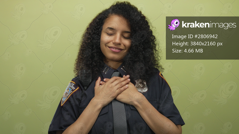 Young hispanic woman police officer clutch chest gesture against a yellow wall in a studio; gratitude.