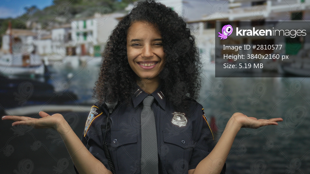 Young hispanic woman police officer extends both hands to sides on a sunlit street; confidence duty service.