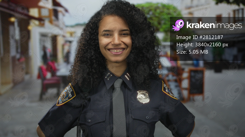 Young hispanic woman police officer in uniform smiling confidently on a lively street outdoors with people and cafes in the background.