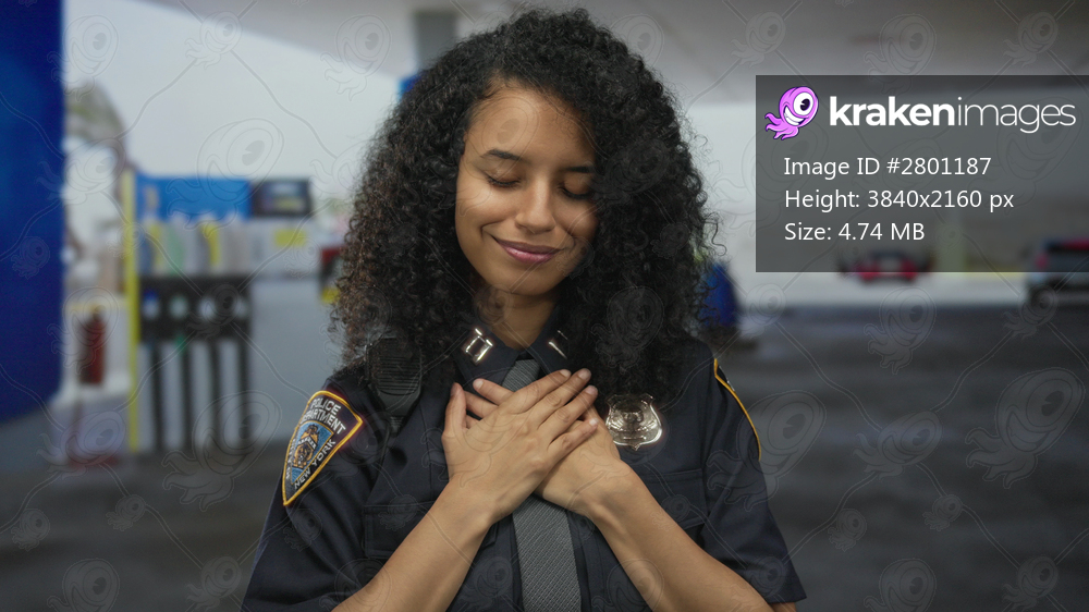 Young hispanic woman police officer in uniform smiling with hands on heart at petrol station outdoors suggesting happiness and fulfillment in duty