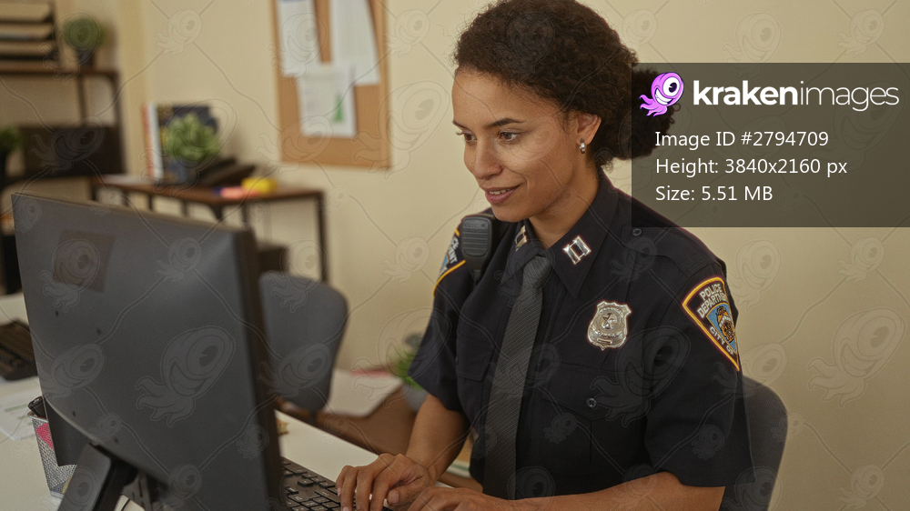Young hispanic woman police officer points finger up for idea in a building at her desk; innovation duty.