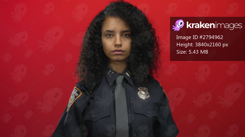 Young hispanic woman police officer stands in uniform against isolated red background wall exuding confidence.
