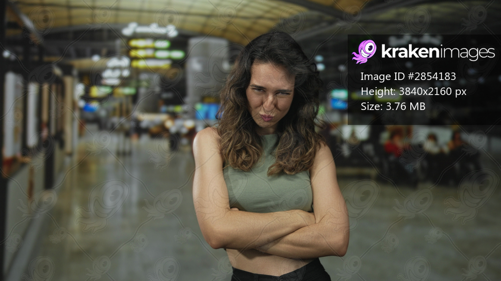 Young hispanic woman with pouting lips standing in airport terminal amid blurred departure gates; playful.
